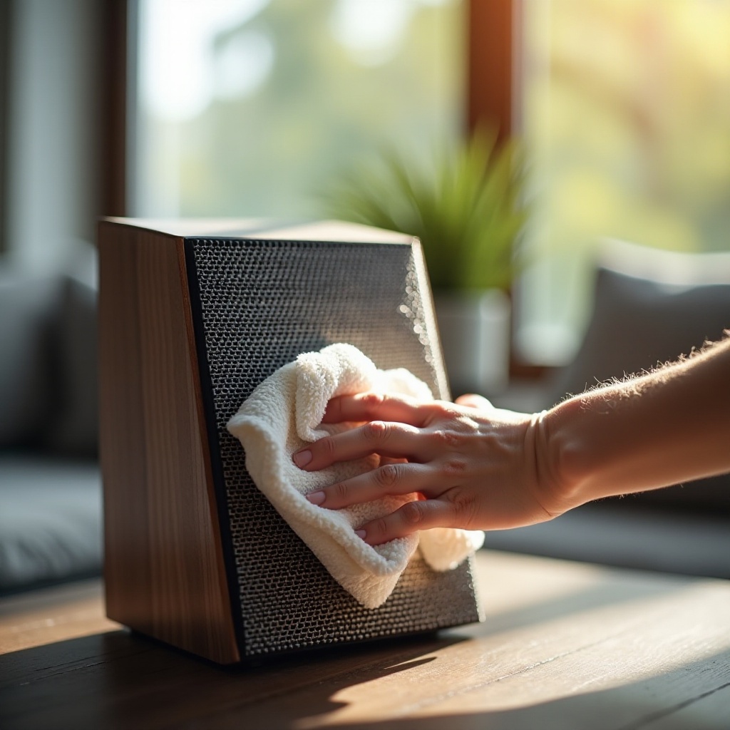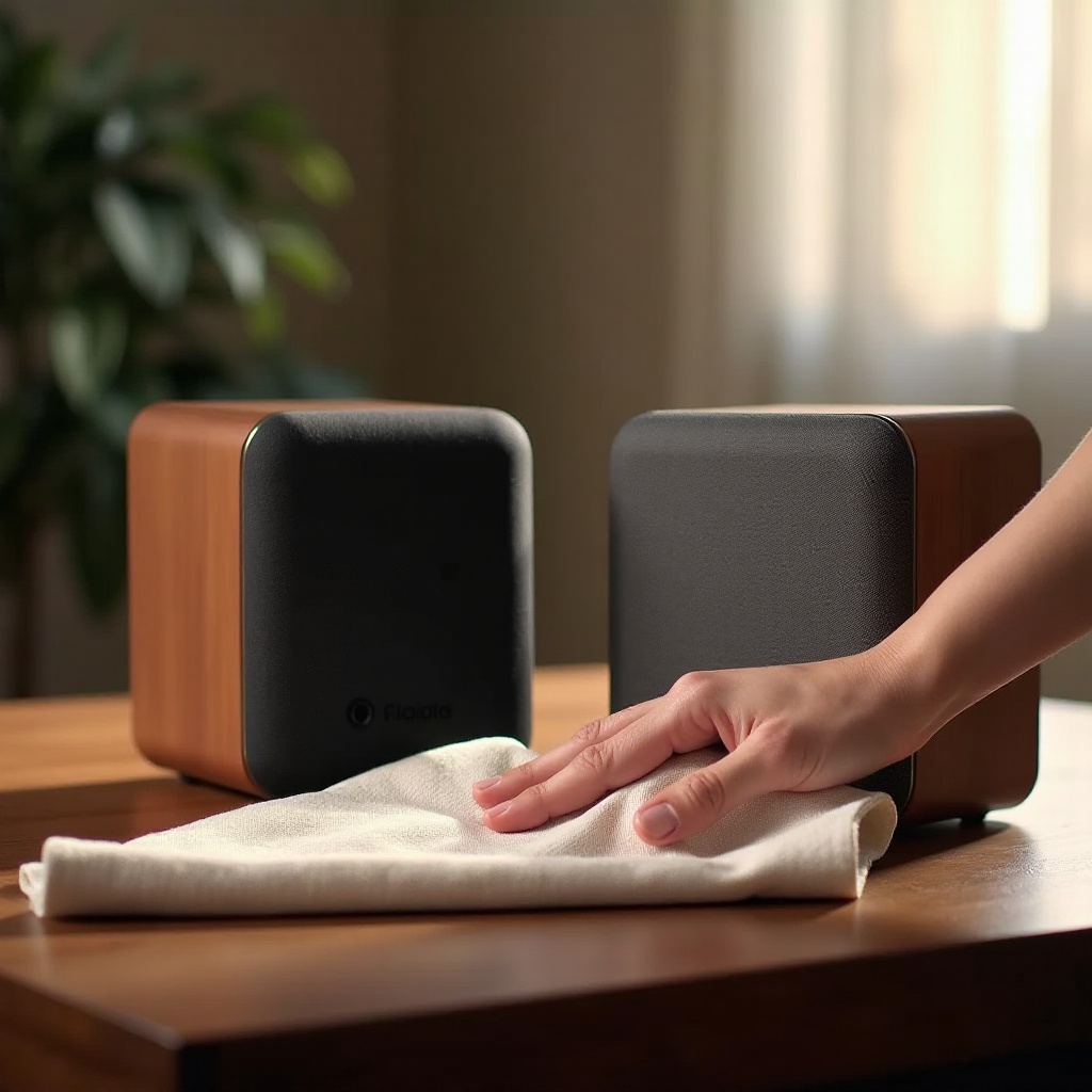 안전 예방 조치와 설정: 전기 위험을 피하기 위해 스피커를 끄고 플러그를 뽑으십시오. 청소 중 떨어질 위험을 최소화하기 위해 안정적인 표면에 놓으십시오.