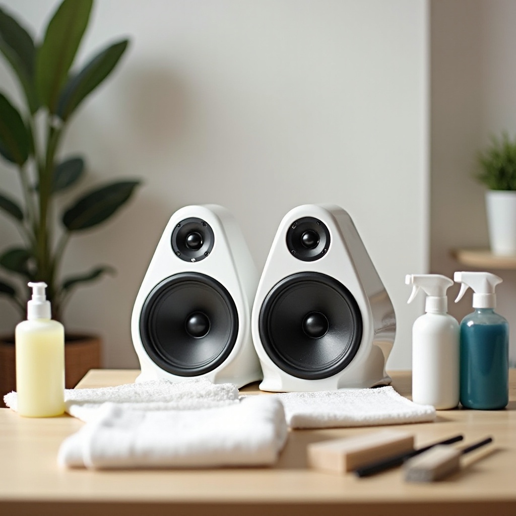Veiligheidsmaatregelen en Setup: Zorg ervoor dat de luidsprekers zijn uitgeschakeld en losgekoppeld om elektrische gevaren te voorkomen. Plaats ze op een stabiel oppervlak om het risico op vallen tijdens het schoonmaken te minimaliseren.